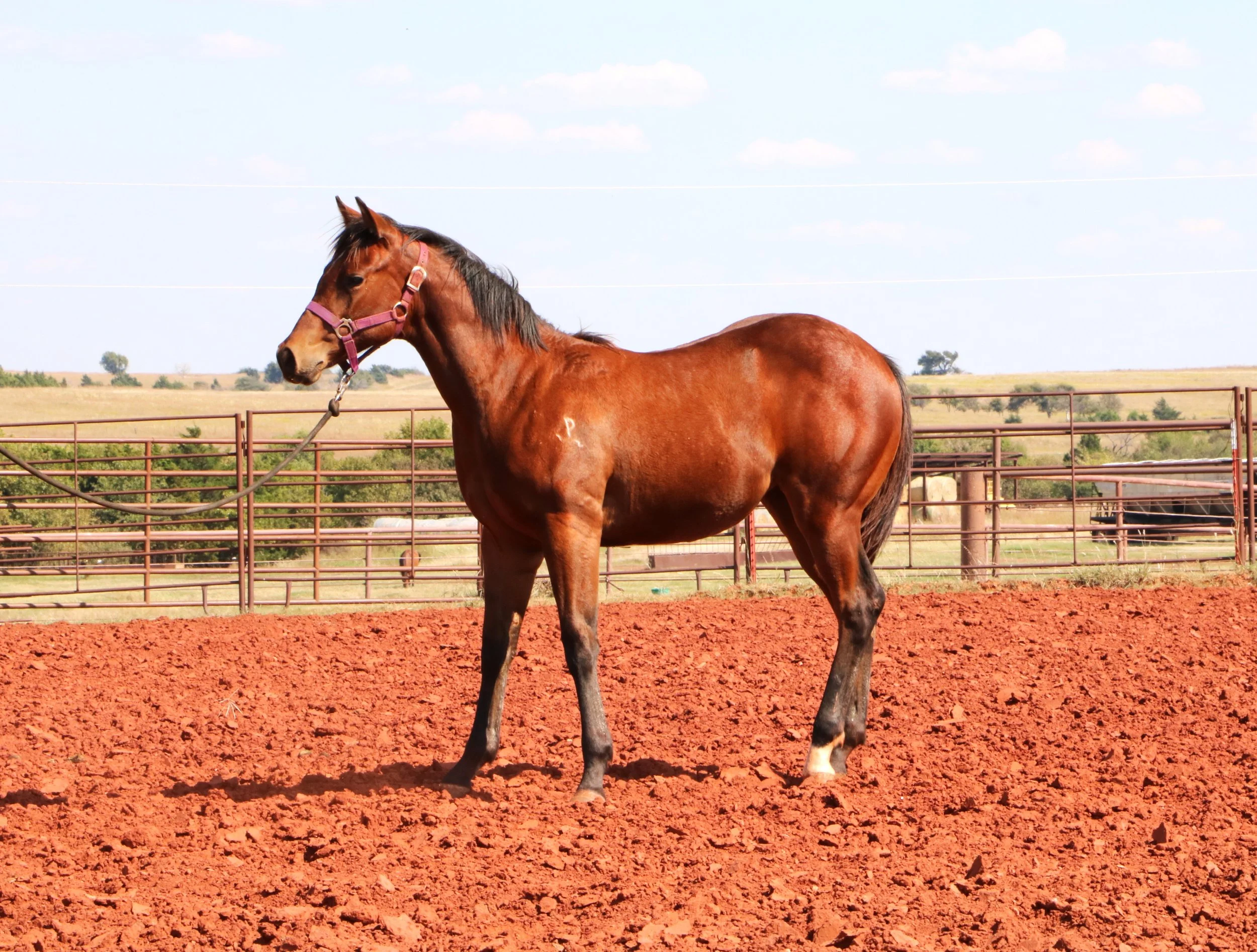 Shada completed 90 days under saddle on May 29, 2022 (Video below.) She is easy to handle and had extensive ground work as a yearling. Shada headed north to Minnesota to continue training under saddle. She was used at area sale barns & has been started on the heel side for team roping. She most recently added doctoring wheat pasture cattle to her resume.