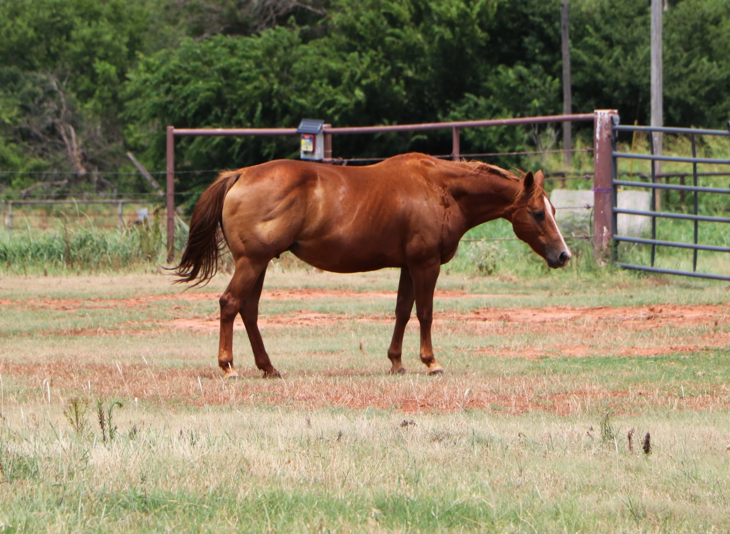 Diva was one of my husband's favorites to use for team roping on the heeling side. In 2020 she won him a saddle & on several occasions - a little cash. He also used her a lot in 2018 to fix and repair fence in the cattle pastures when the flooding destroyed it over and over again. She's very handy-broke but requires a confident rider. She prefers to be busy & was a great mount. Due to arthritis in her left front knee, caused by another mare kicking her in the pasture, she is broodmare sound only.